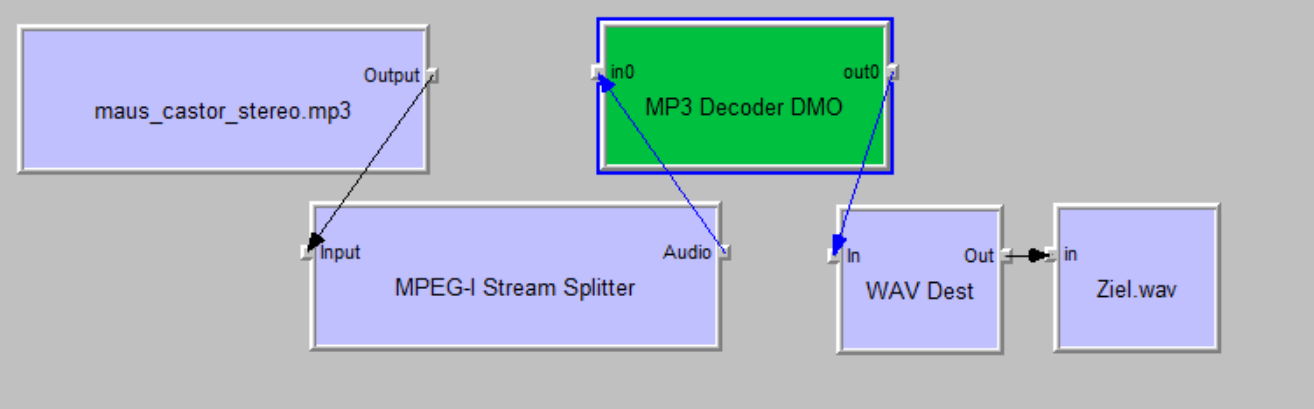 Ereugen Sie die entsprechenden Filtergraphen manuell. Die Dateinamen für Quell- und Zieldatei sind über ein IFileSourceFilter-Interface (bzw. über ein IFileSinkFilter-Interface) zu benennen. Fügen Sie die erzeugten Filter dem Filtergraphen hinzu und verbinden Sie die entsprechenden Pins wie in der nachstehenden Grafik angegeben (achten Sie dabei auf die genaue Pin-Bezeichnung!).