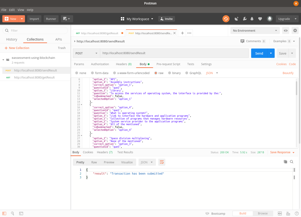 getResultwhich will fetch result from the fabric ledger, it needsemailIdas a query param of the candidate who has already taken the exam/test. Check request and response formats. This API callsqueryResultchaincode function. -