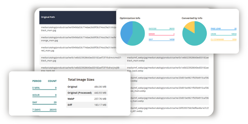 This is why the Magento 2 WebP Images Extension offers you in-depth statistics on the image conversion process. Use vivid graphs to see how many images have been converted and how many are pending. Monitor the compression level and image sizes throughout the process.