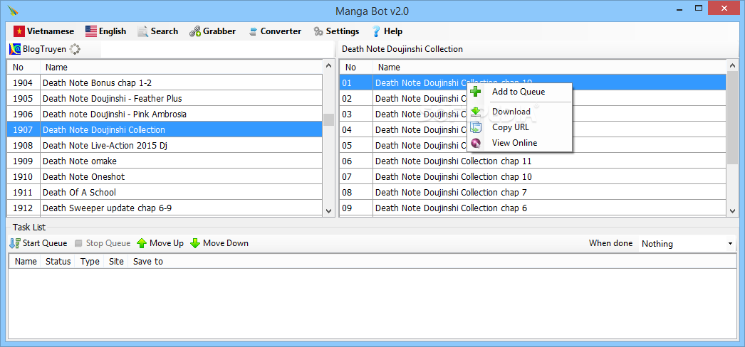 - [NEW] Allow to grab list of chapters from an url of manga. Only two sites blogtruyen.com and mangafox.me