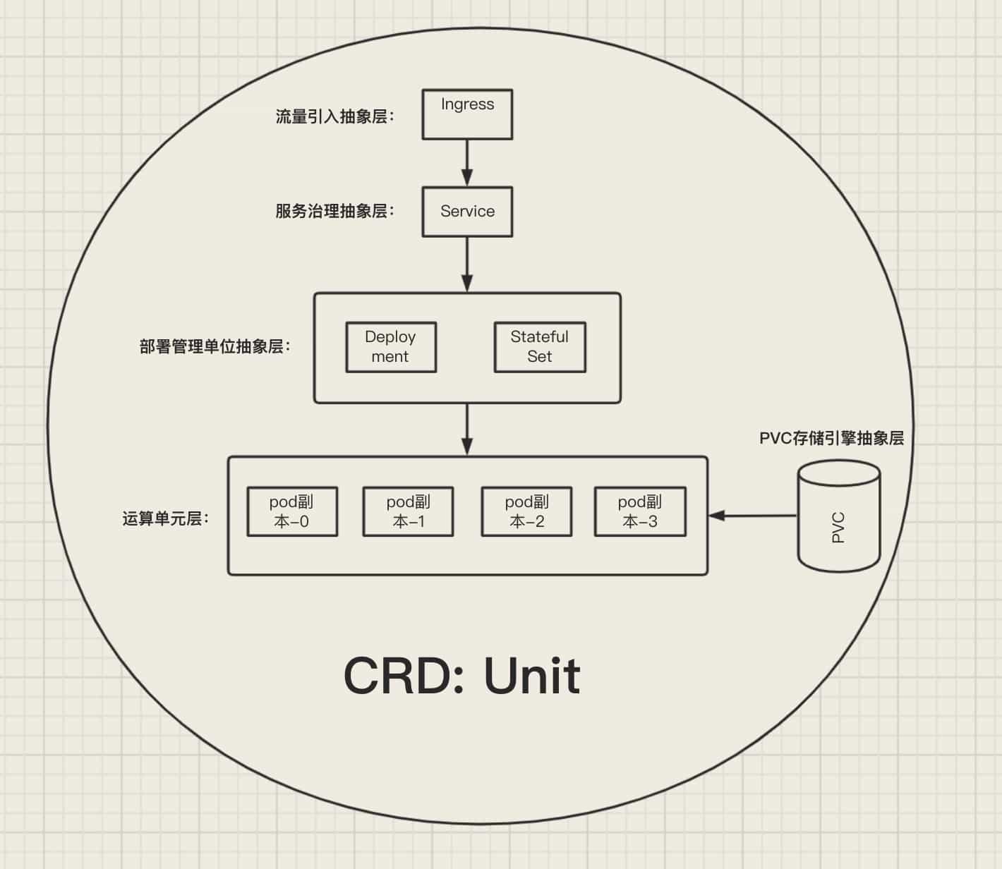由此,我将这个CRD命名为"Unit",这意味着,StatefulSet/Deployment/Ingress/Service/Ingress这些可选的build-in资源,由原本松散组合构成一个运行服务的模式,变为集合在一个单元里。在上层,用户可以在一个声明文件中定义服务所需的各类资源组合,部署和维护一个服务时,仅需一对一地维护一个Unit CRD资源对象;在下层,CRD控制器按照Unit声明,实现对各个关联子资源进行统一管理。如下图: