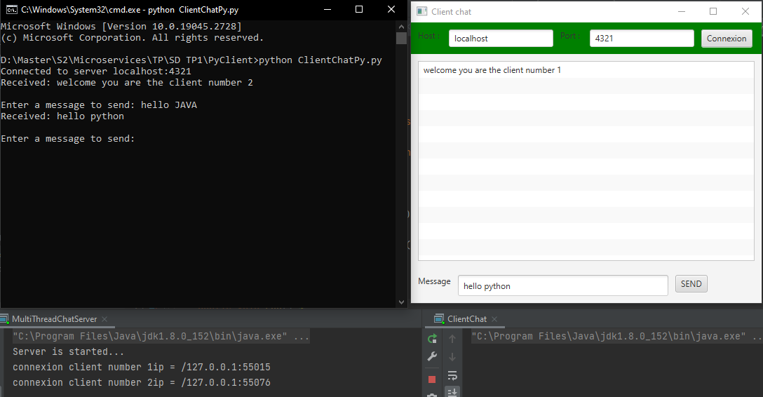 - La communication entre Client Python et Client dans Java vers un serveur