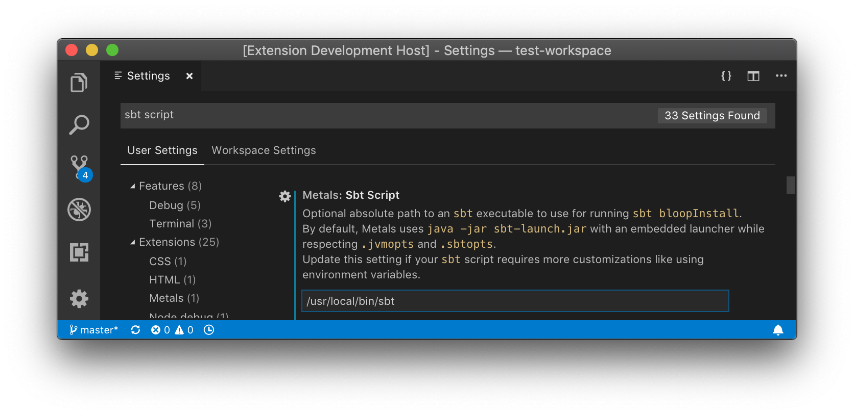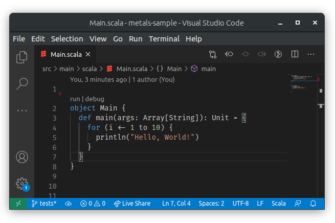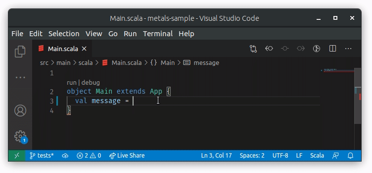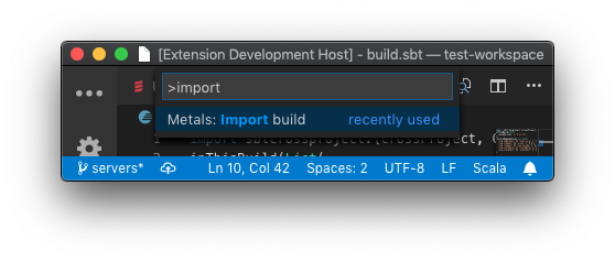 tail -f .metals/metals.logto watch the build import progress. - Behind the scenes, Metals uses Bloop to import sbt builds, but you don't need Bloop installed on your machine to run this step.