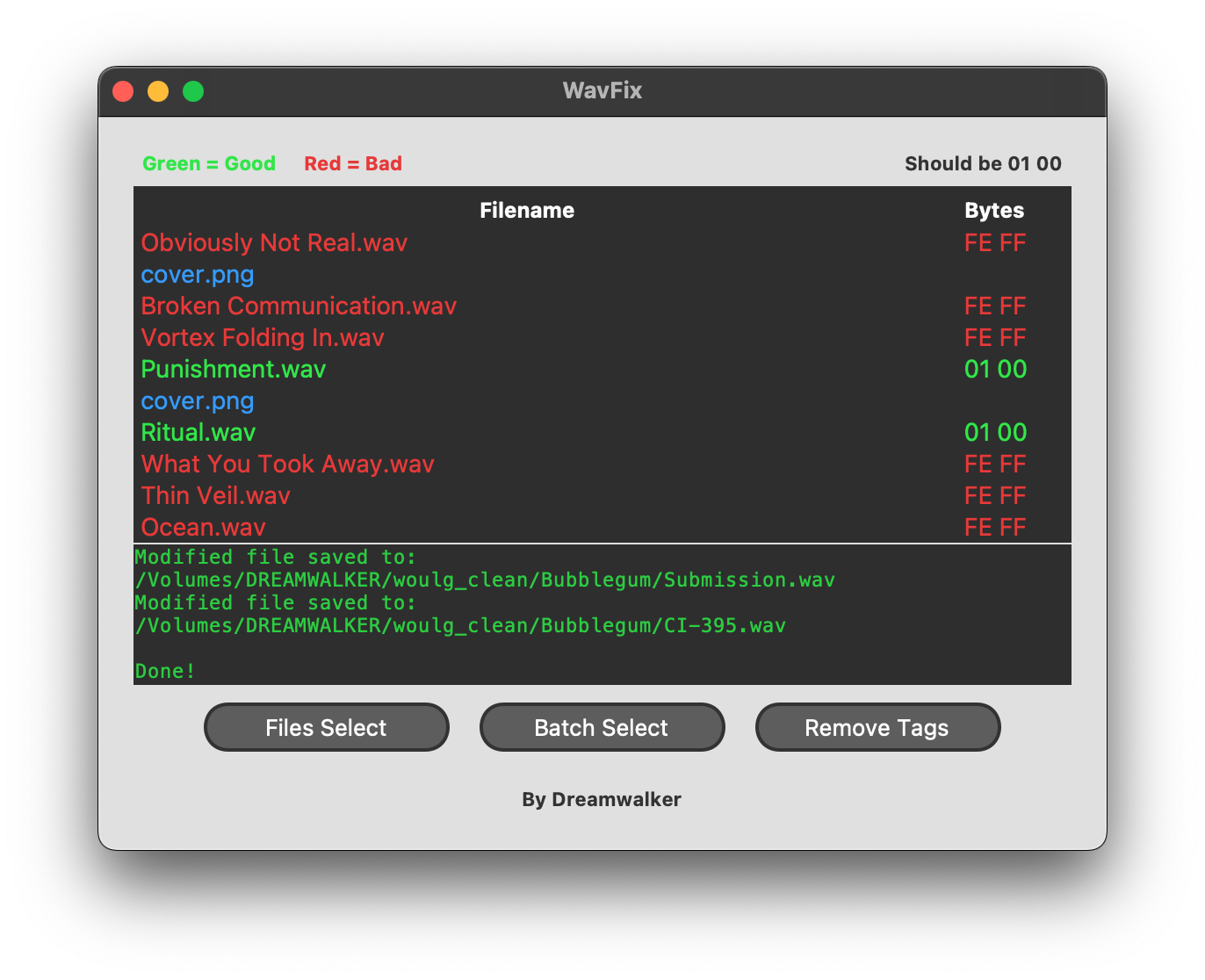 This is an update to the initial release of WavFix, a lightweight application designed to fix the Pioneer DJ Error E-8305, caused by the wFormat flag inserted into some WAV files. The application corrects this error without encoding or changing the audio. WavFix also supports batch processing and visual inspection of the files.