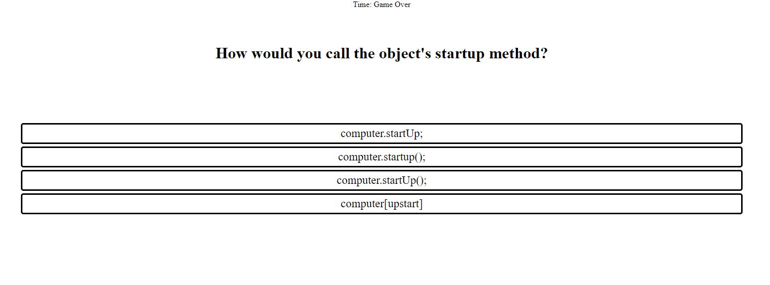 starting with score = 0 and the timer "timeLeft" = 60 seconds function init() { score = 0; timeLeft = 60; }