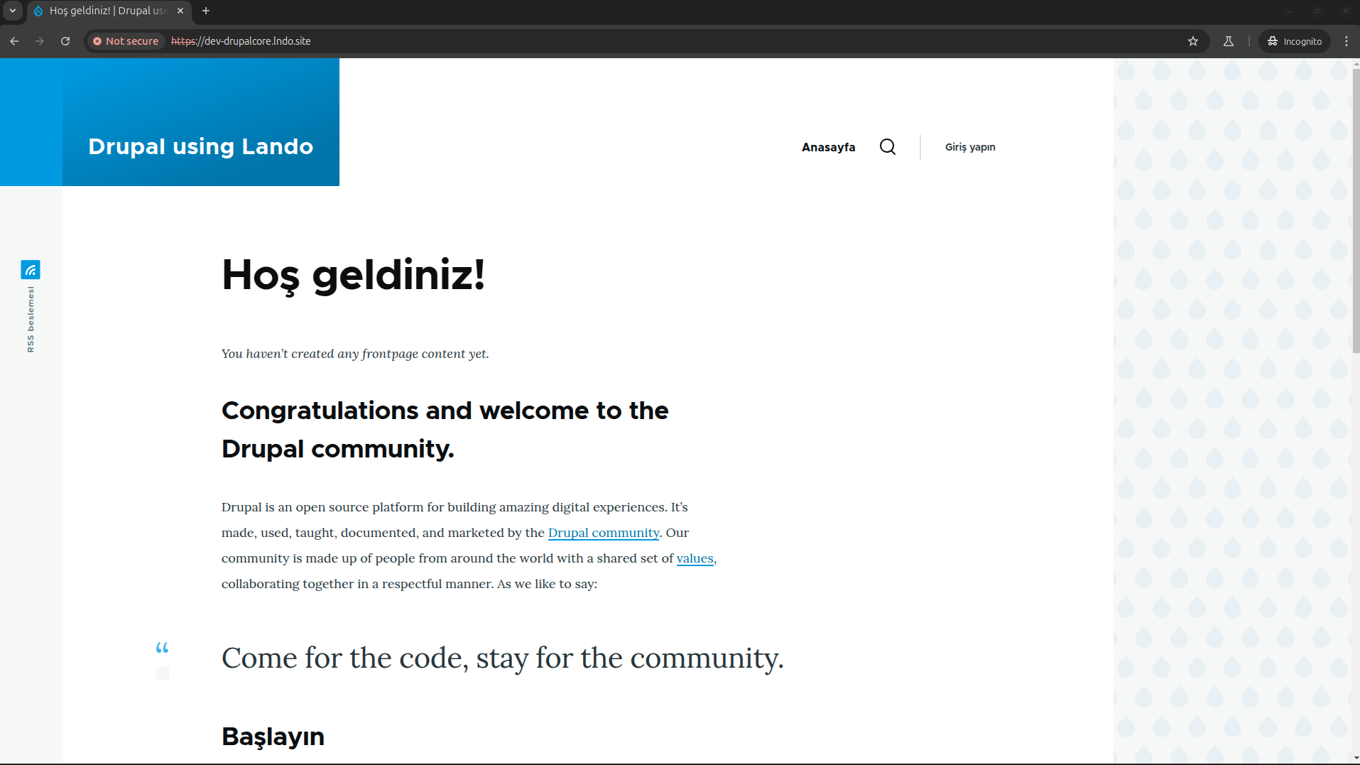 --yesIf you want to perform a standard Drupal installation with a different language, change the locale option (in this example tr (Turkish) is used):