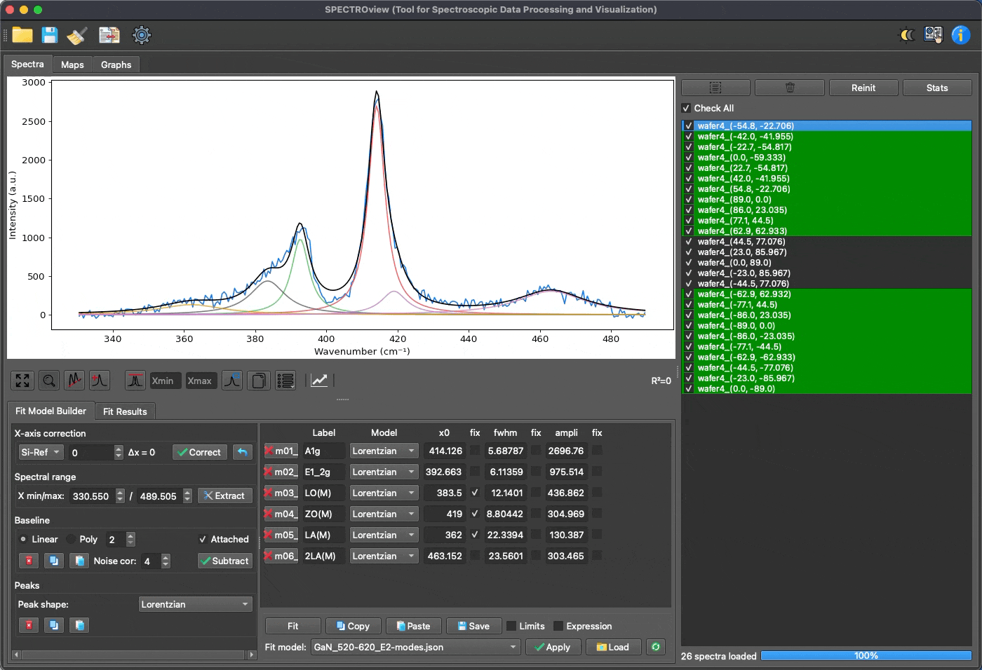 Create fit models, copy/paste to others, saved fit model for later use, use defined fit model for fitting multiple spectra, wafer data, and 2D maps, collect all best-fit results with one click: