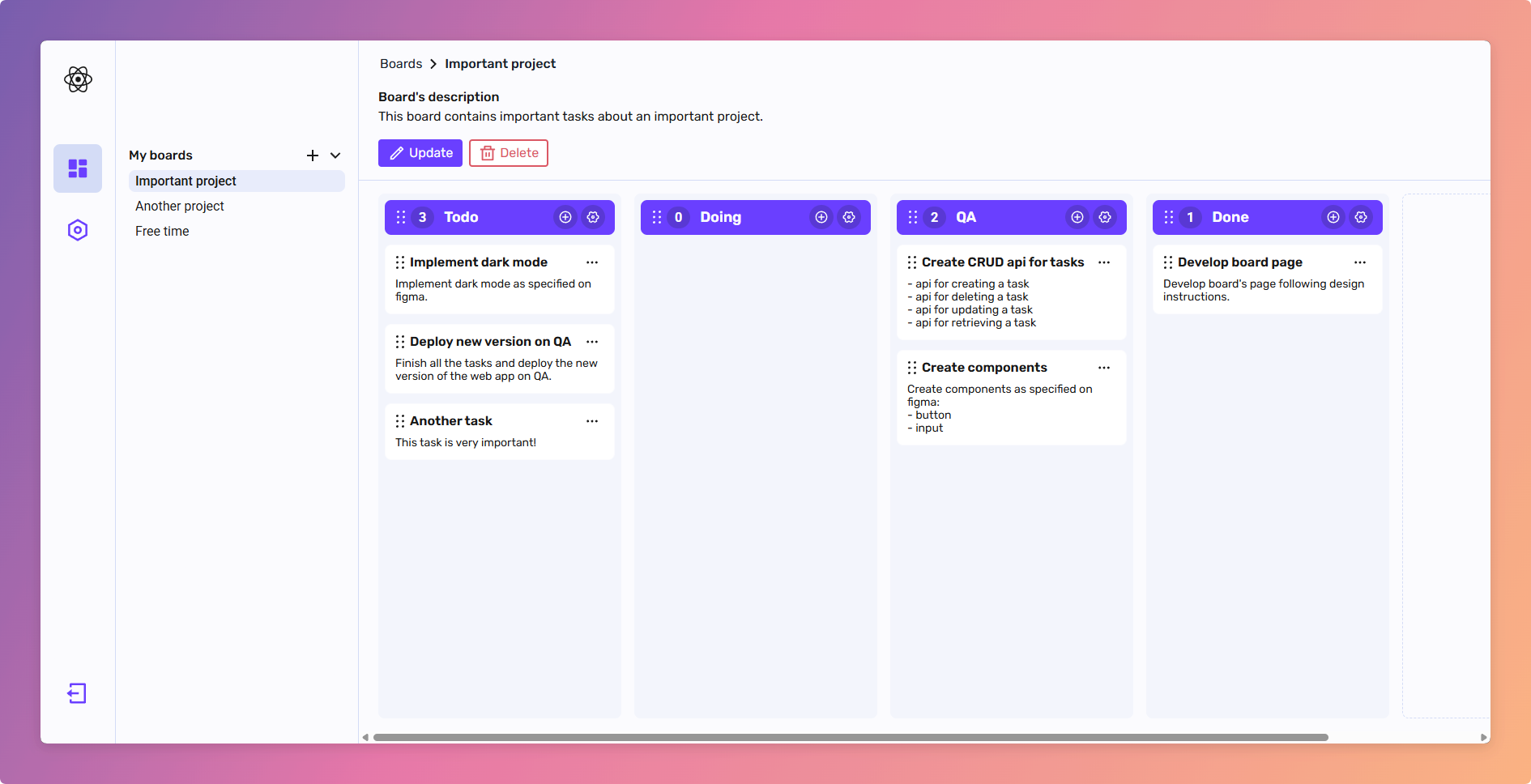 At the moment, I implemented basic features. Occasionally, I might hop on this project and add new stuff (e.g. shared boards, dark theme, subtasks).