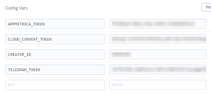 heroku config:set TELEGRAM_TOKEN=123456789:AAABBBCCCDDDEEEFFFGGGHHHIIIJJJKKKLL # set config vars, insert your own