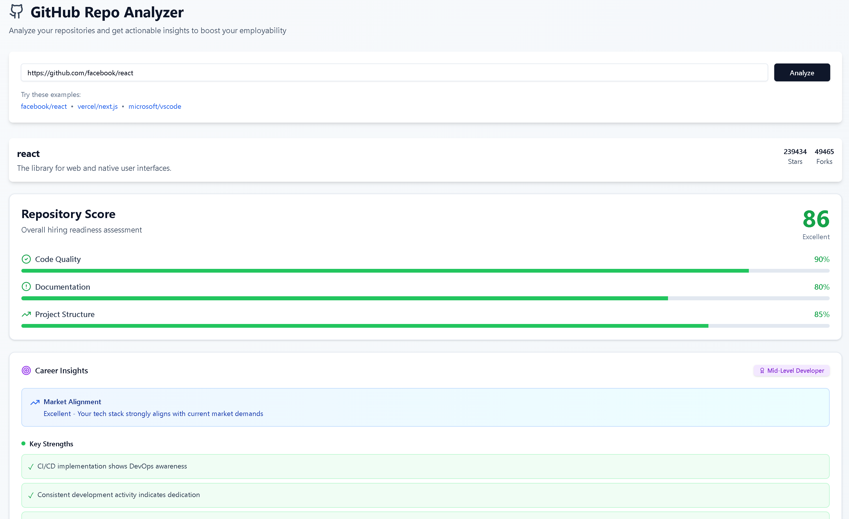 - Smart Scoring: Get a comprehensive score for your repositories based on code quality, documentation, project structure, and more.