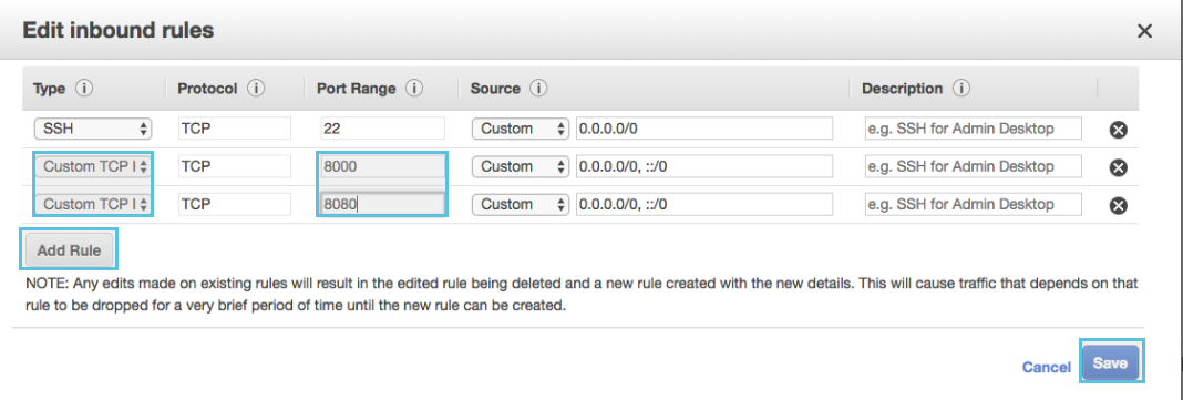 - Inbound -> Edit -> Add Rules Button -> custom -> 8000, 8080 열기 -> save