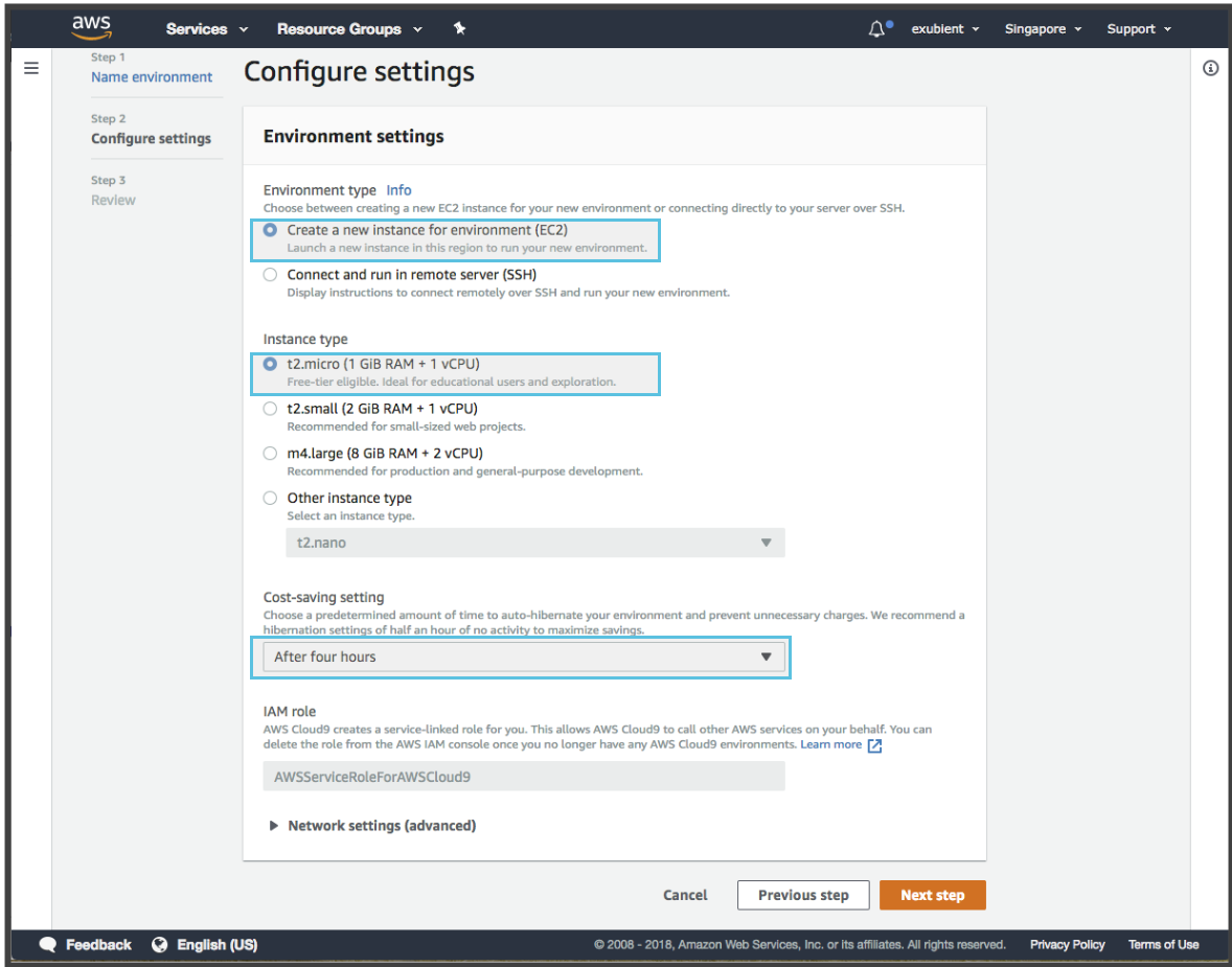 Create a new instance for environment (EC2 설정) --> Instance Type은 t2.micro설정