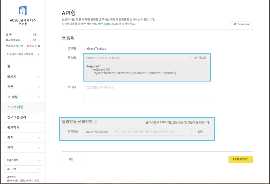 카톡 플러스친구 API TEST Function