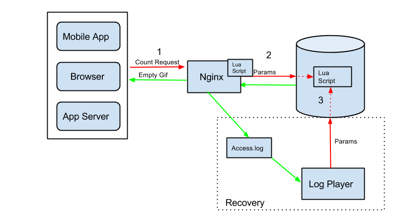 Count-von-count comes with a log player. It is very useful in cases of recovery after system failure or running on old logs with new logic. Its input is an access log file (a log file where the Nginx logs each incoming request). It updates Redis based on the voncount.config.