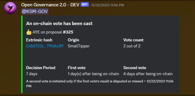 docker cp .env internal-gov-2:/app/When the bot votes is dictated by /data/vote_periods. Each origin of a proposal has its own setting on when the first vote should be made & second. A second vote will only be made if the result differs from the first vote. If the first vote is AYE and it remains AYE on the second period then no vote will be made on the network.
