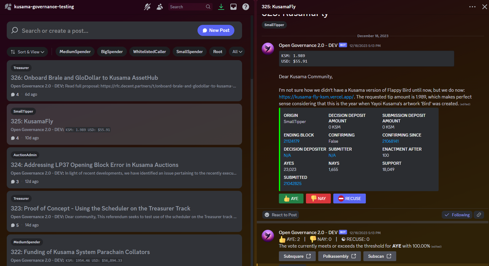 A dedicated discussion forum within your Discord server, specifically designed to facilitate thoughtful and constructive conversations around ongoing proposals. This interactive platform empowers members to openly share their insights, perspectives, and opinions on each referendum prior to the submission of an official vote by the designated proxy account on behalf of the collective or DAO.