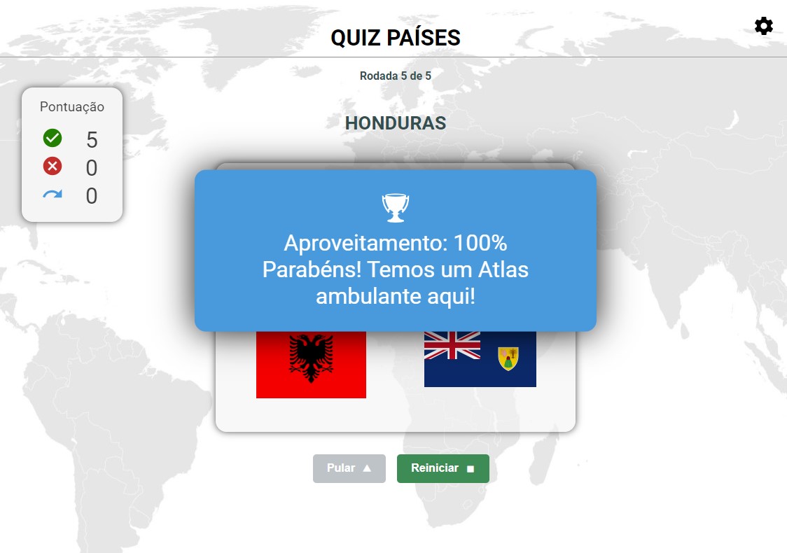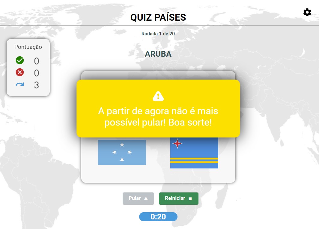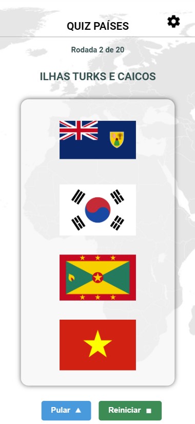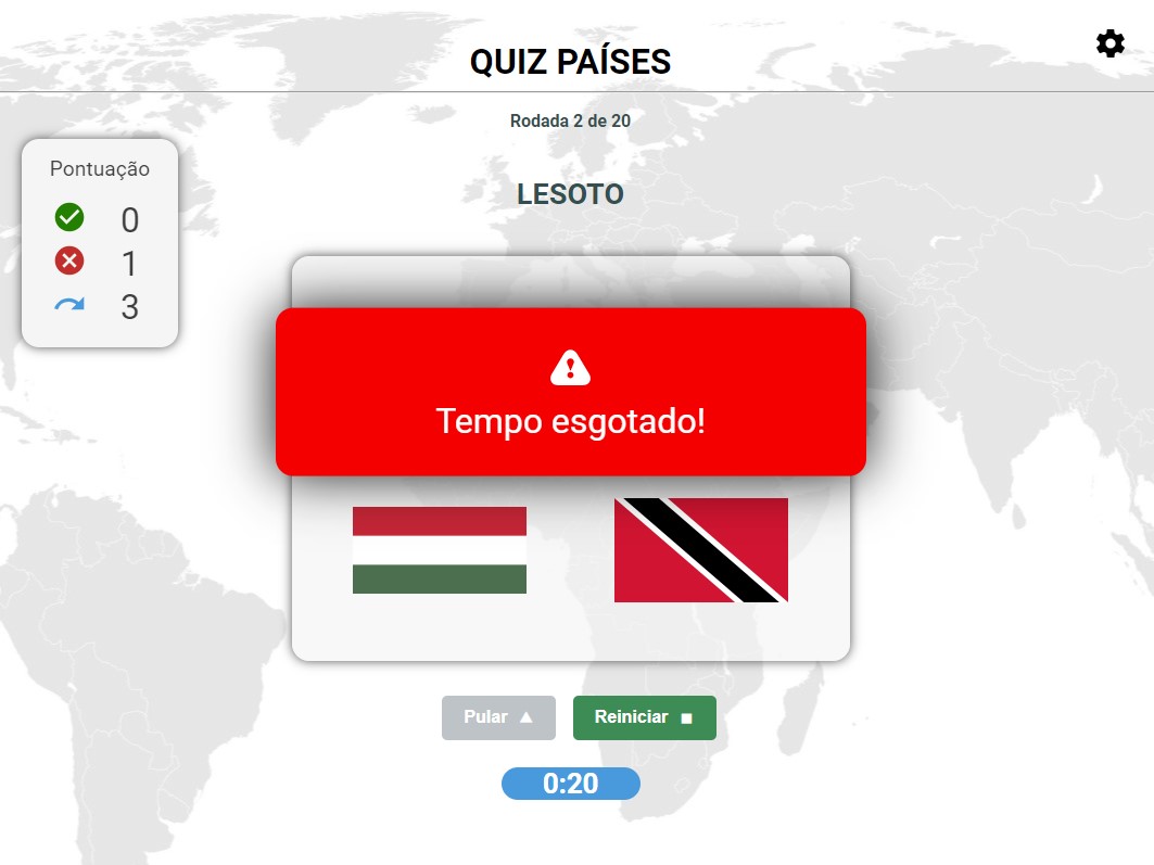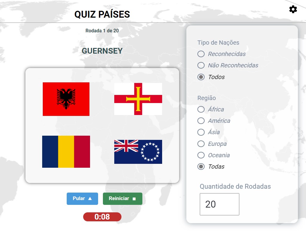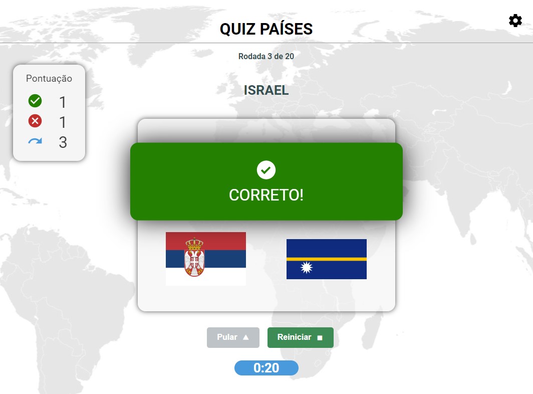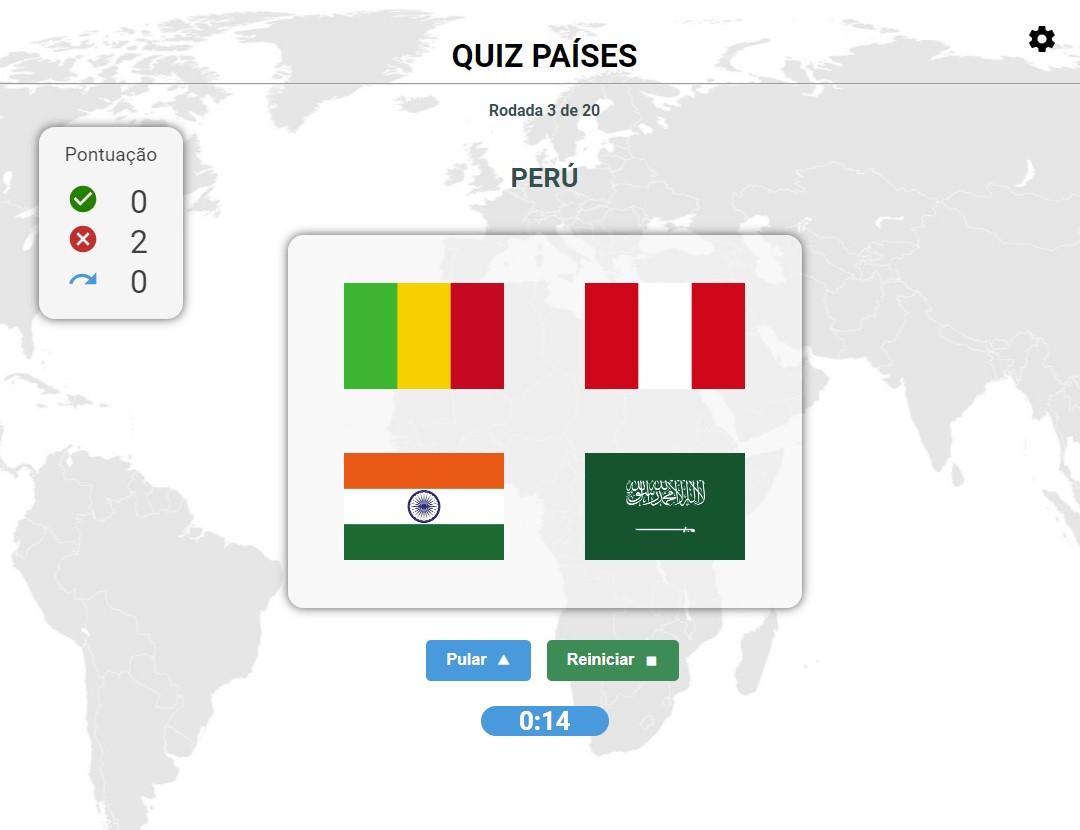 Quiz sobre países, apresentando a sua bandeira e o jogador deve escolher uma entre as 4 opções para validar sua resposta.