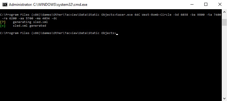 taser.exe -c -lh 15 -ad 1600 -bd 8507 -ba 8700 -ta 7100 -ra 6200 -aa 5900 -ma 4000 range 64C West-Bomb-Circle