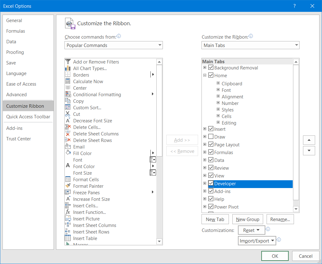 - go to "Customize Ribbon" -> check the ribbon named "Developer" in Main Tabs