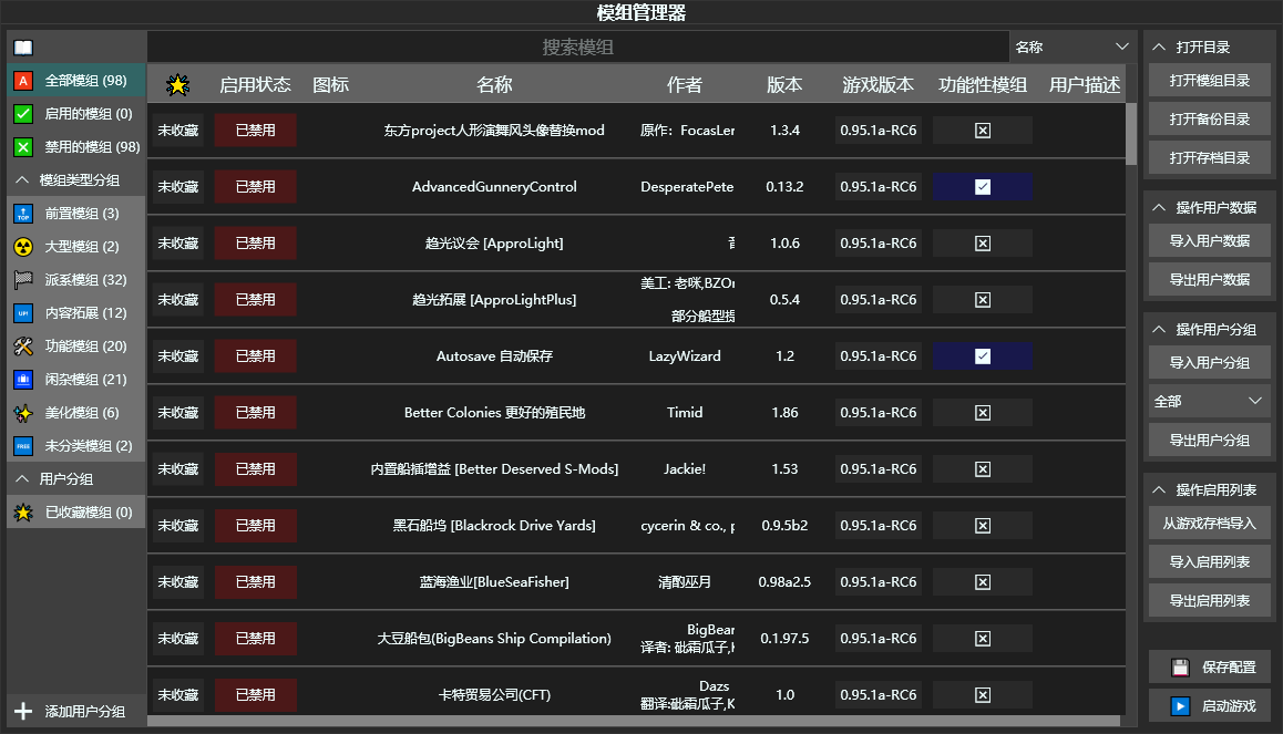 StarsectorToolbox 远行星号工具箱 环境: .NET6 前言 对游戏 远行星号 提供如模组管理,游戏设置等诸多功能 并可以使用外部 API 来增加拓展插件以提供更多功能,对制作插件有兴趣可以查看 拓展教程 若有需求的功能或建议及意见,欢迎提交 issue 若在使用中遇到任何问题,请提交 issue ,并附带日志信息 若发现有模组在 未分类模组 中 ,请提交 issue ,并提供其 ID 及应该在的分类 下载 站内链接 GitHub 已实装菜单 模组管理器 游戏设置 异常信息收集工具 插件列表 插件的使用方式: 将插件压缩包解压至 STExtension 文件夹即可 肖像管理器