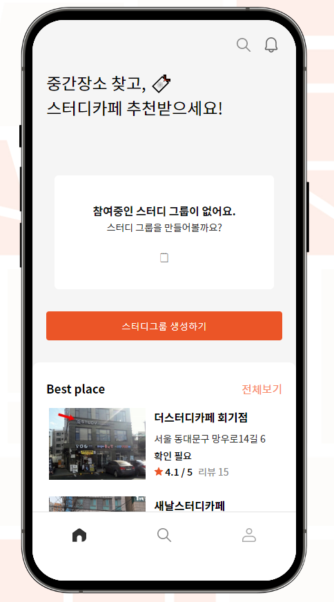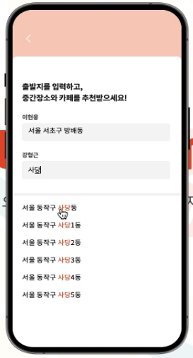 - 같은 스터디 그룹내의 사용자들이 입력한 주소들의 위 · 경도값을 바탕으로, 지도 위에 각 사용자들의 중간에 위치한 스터디카페들을 추천해줍니다.
