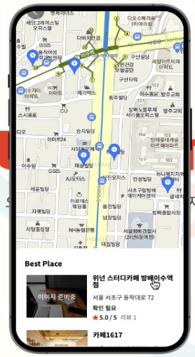 - 현재위치를 바탕으로, 사용자 주변의 스터디카페들의 정보들을 Kakao Maps API로 부터 받아와서 보여줍니다.