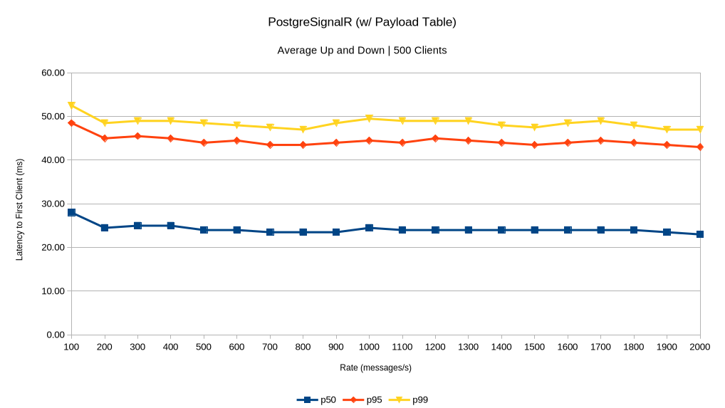 An unexpected result is that PostgreSignalR behaves much more consistently when using the payload table. Past 1800 messages/sec in these benchmarks it appears that the payload table would be preferred. YMMV of course!