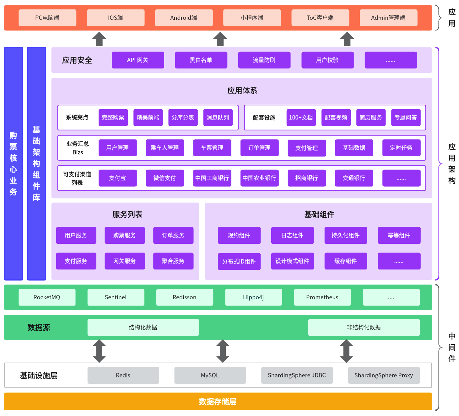 下方的架构图全面描述了项目的服务集合、组件库列表和基础设置层等要素,有助于用户快速了解 12306 平台的顶层设计和业务细节,从零到一进行构建。
