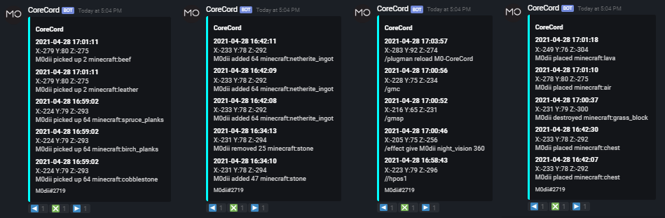 Discord integration for CoreProtect plugin, supports both SQLite and MySQL databases.