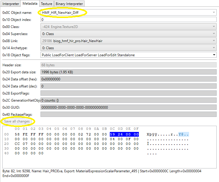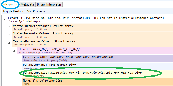 You must then link the textures to the material. Choose the material instance (Export 29187 in Figure 13). Go to the Interpreter tab, then under TexterParameterValues, expand Item 0 (the diff texture entry) and enter the export number for the correct Diff texture (green highlight).
