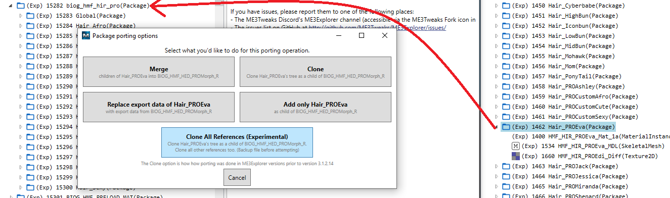 Drag Export 1462 Hair PROEva (in the BIOG_HMF_HIR_PRO file) over to Export 15282 biog_hmf_hir_pro (in the BIOP_Char file). Choose Clone All References (Experimental). Ta-da! We have EDI’s hair at the bottom of BIOP_Char’s hair package.