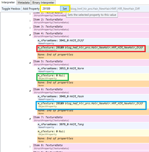 Item 4 is the main hair Diff texture (red highlight). Enter the Export number (that you noted down in Step 3) as the property (yellow highlight). Item 5 is the Norm texture. Most mods won’t have one, in which case enter 0 as the property (green highlight). If you do have a Norm, enter the Norm’s export number instead. Item 6 is the mask (blue highlight). Very, very few hairstyles have a specific mask texture (though Mohawk does). If there’s no specific mask, enter the Diff texture’s export again here. Item 7 is the Tang texture. This is almost never used, and should be set to null.