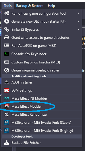 First, open ME3Explorer – ME3Tweaks’ Fork. This can be accessed via the Mod Manager’s tools menu. Do not use the original ME3Explorer 3.0. This version is outdated, may break your game, and does not support the steps in this tutorial.