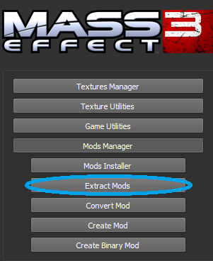 In Mass Effect Modder, under the Mass Effect 3 header, go to Mods Manager → Extract Mods and choose the texture file shipped with the mod. It will ask you to designate a folder where the extracted .dds files will be saved.