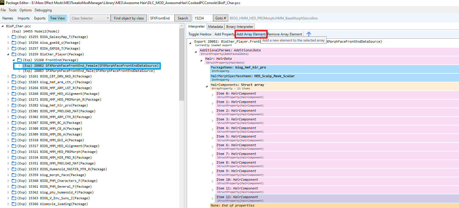 The right-hand pane (Interpreter tab) has a number of options. Expand the file tree as shown in Figure 20. Items 0 through 12 correspond to the 13 vanilla hair options available to FemShep during Character Creation. We need to add one. Select the final entry (Item 12) and “Add Array Element” (highlighted in red).