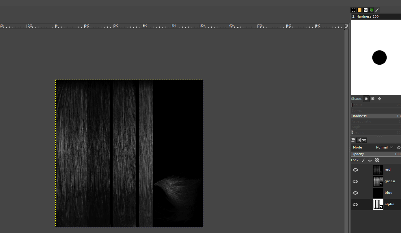Open your texture file in GIMP. Choose Colours-→Components-→Decompose. Choose RGBA as the colour model and make sure “decompose to layers” is checked. Click okay. You should now have a greyscale image with four layers.