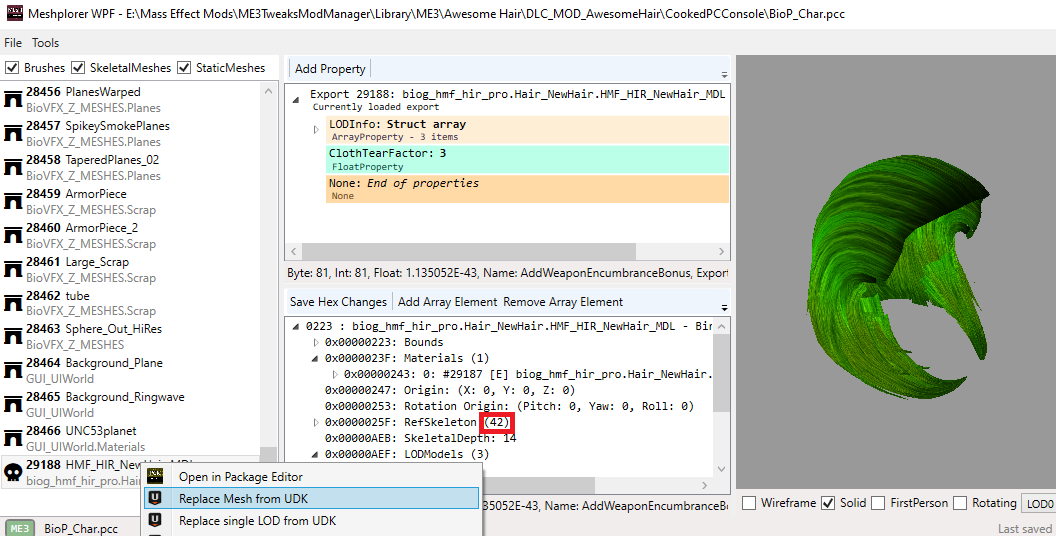 Find your new hair mesh – it should be at the bottom. The number of bones is highlighted in red. You can only import a mesh with the same number of bones. Right-click, Replace Mesh from UDK. You’ll get a little dialogue box with a drop down, but there will only be one entry in it. Choose that, watch your new mesh load. Save the file. Close Meshplorer.