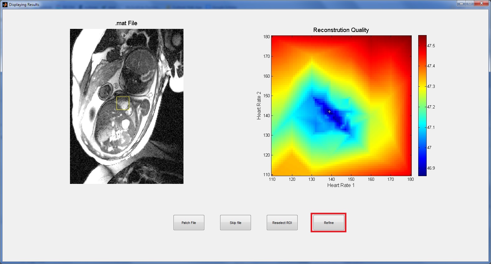 Once two-parameter optimization is complete a plot of two heart rates applied to the two halves of the scan and entropy as a metric of reconstruction quality.