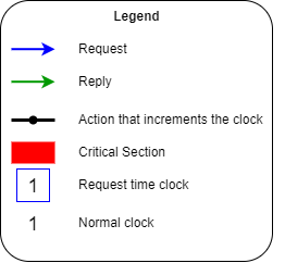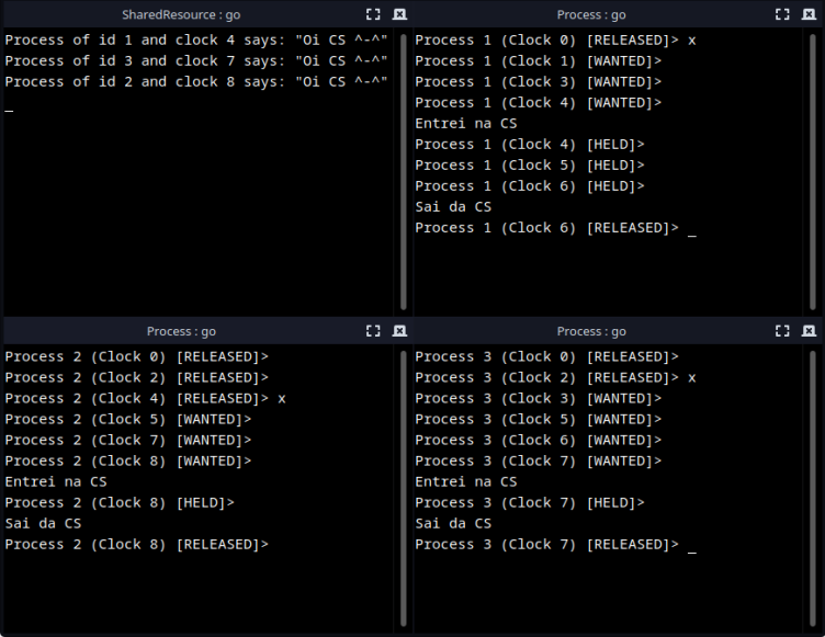 On each terminal running a process, it will show the process ID, its clock, and the current state. The state can be either "RELEASED", "WANTED", or "HELD". The clock is incremented every time the process requests or releases the critical section.