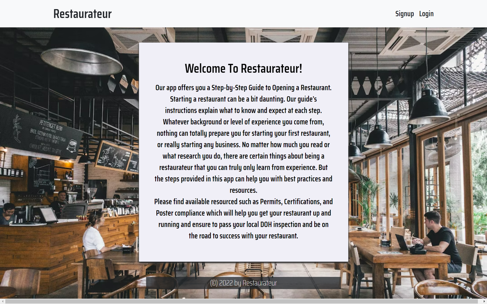Welcome to our Group Project 03 -- Restaurateur! Starting a restaurant can be a bit daunting. Our instruction app offers you a Step-by-Step Guide to Opening a Restaurant in New York City.