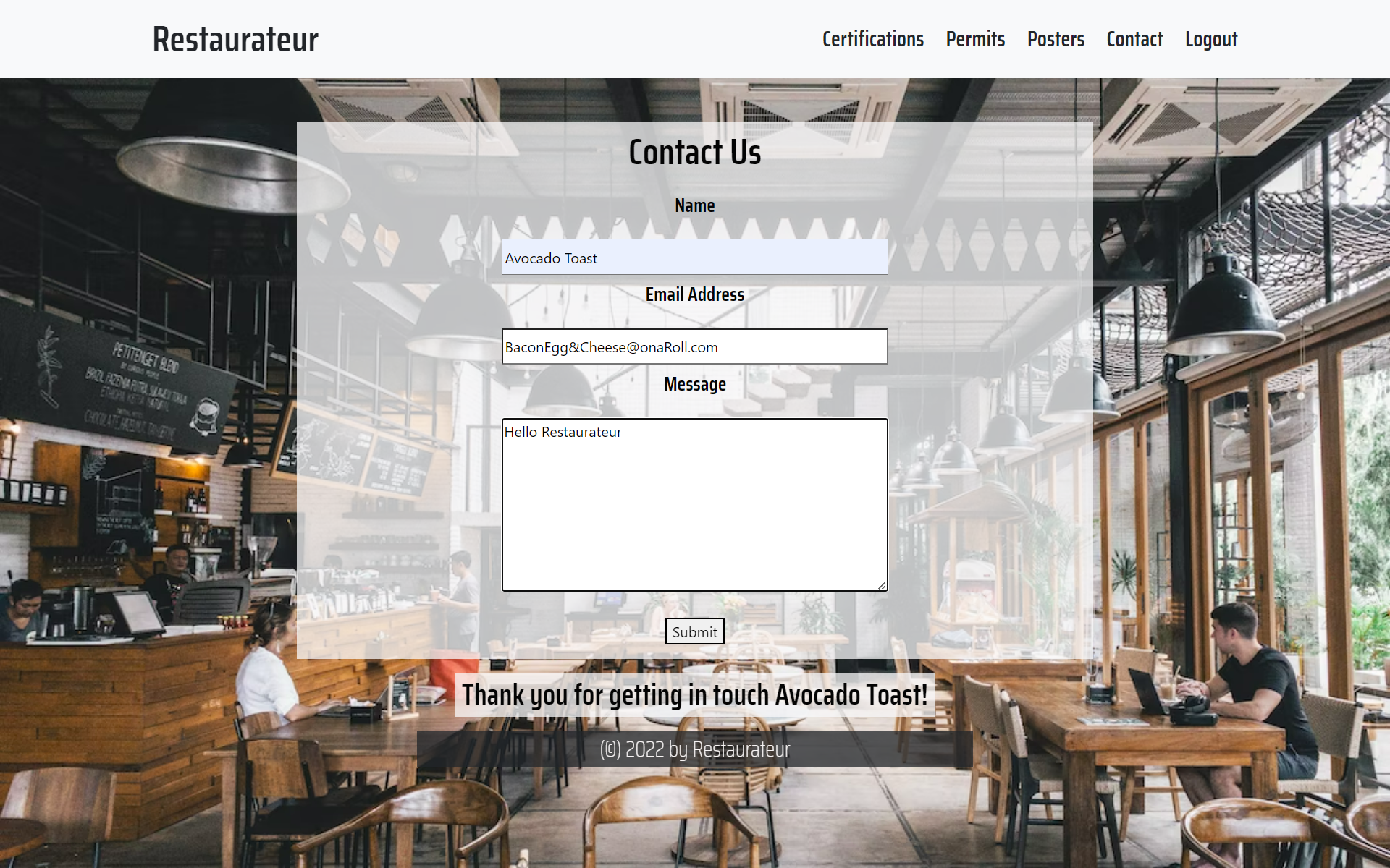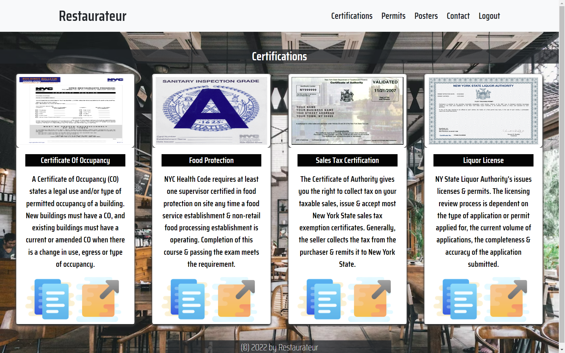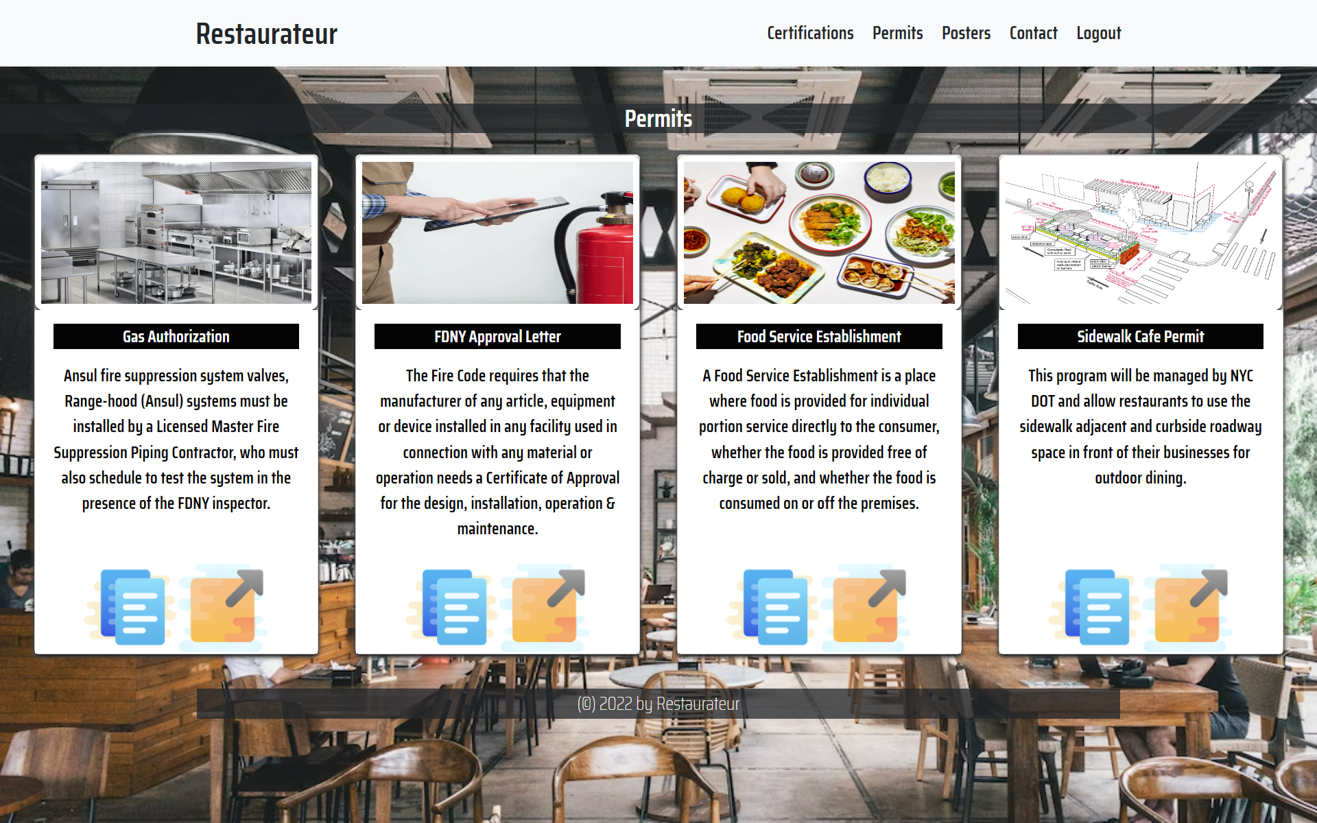 - When a user is logged in, they are presented with options on the navigation bar, each featuring Certifications, Permits, Posters, Contact and logout.