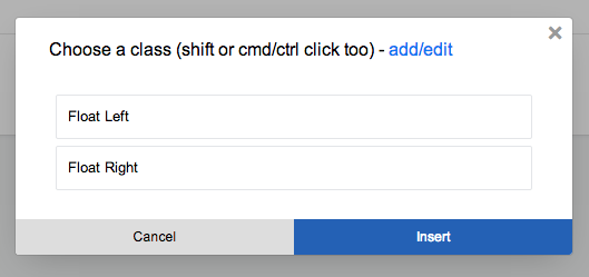 Choose the classes you'd like to apply to the element. You may apply multiple classes by SHIFT clicking a set of classes or by CTRL (Win) or CMD (MAC) clicking each class one by one. CTRL/CMD click again to unset a selection.