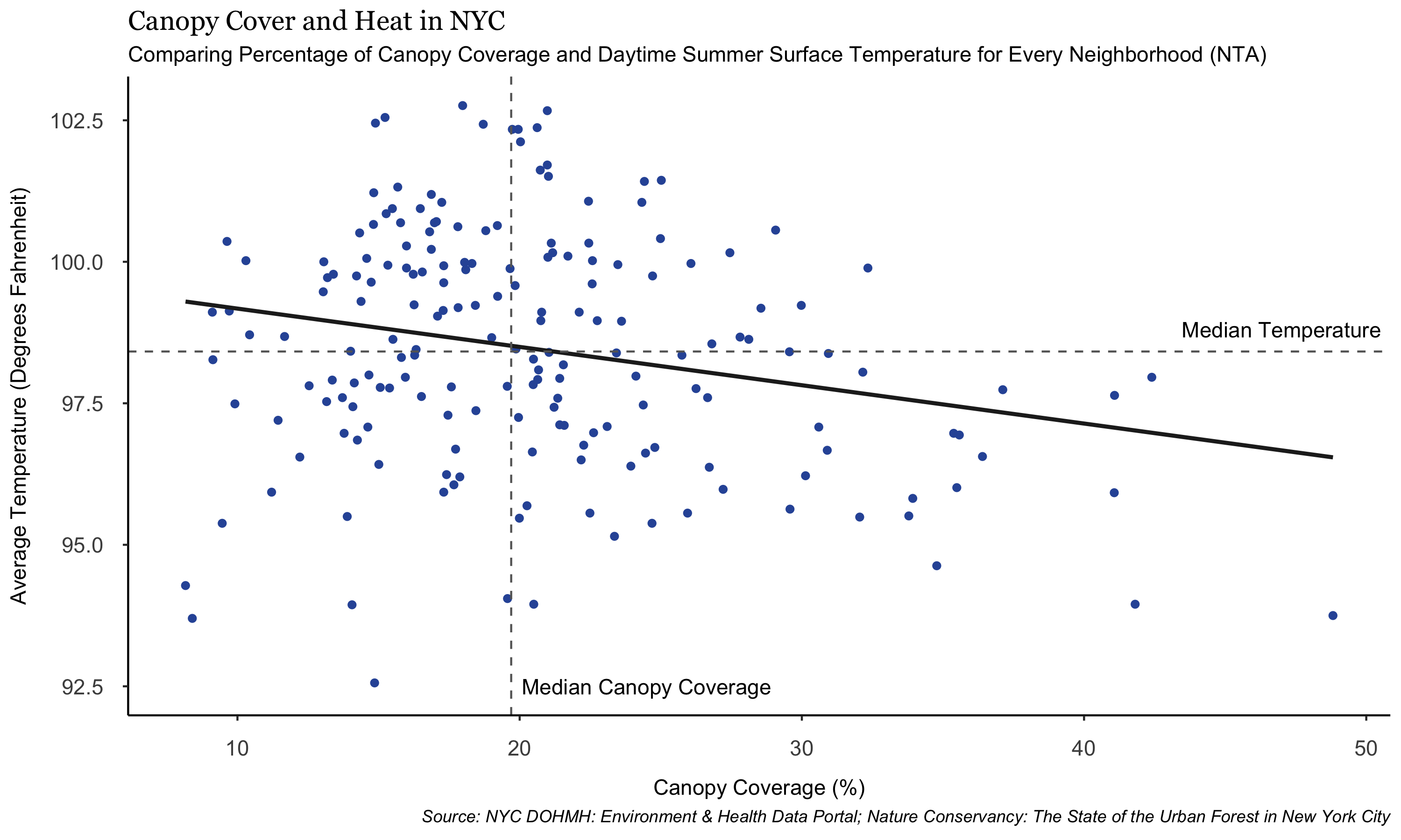 - Neighborhoods with lower canopy coverage tend to also have higher daytime summer surface temperatures.
