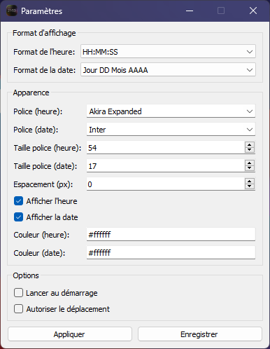 - 🎨 Personnalisation avancée : police, taille, couleur, espacement, visibilité heure/date
