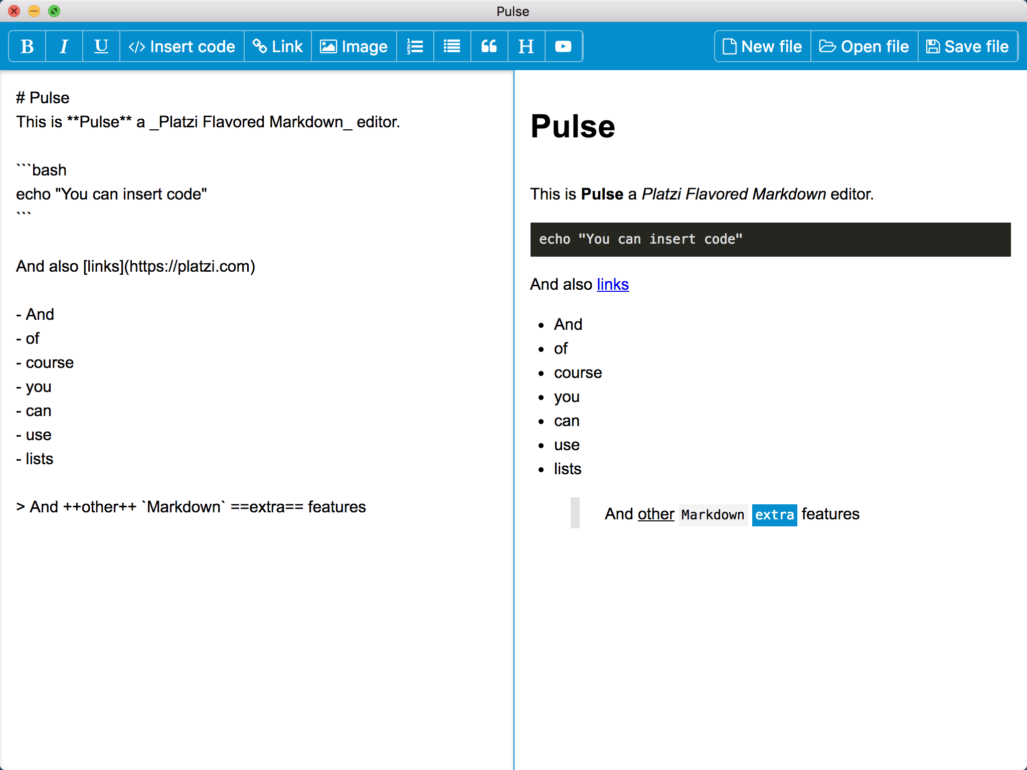 Pulse A Platzi Flavored Markdown desktop editor Development Install dependencies with yarn Start app with yarn start Building for production Install dependencies with yarn Build app with yarn dist