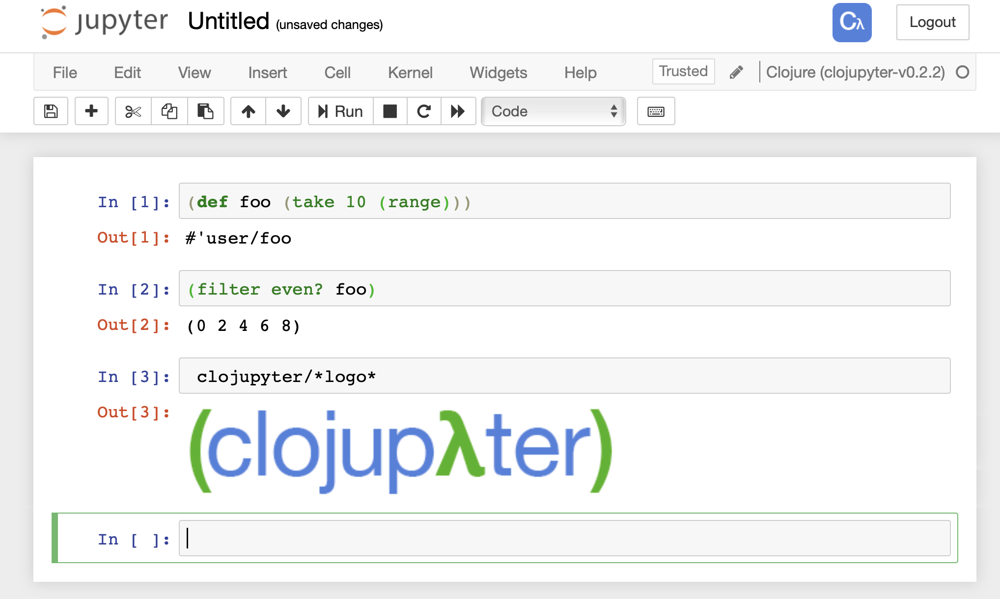 jupyter-notebookand select the Clojure kernel.