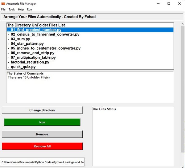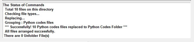It is a User friendly GUI program that helps you managed your unfolded files in a folder respective their extensions {Such as : .jpg, .doc, .xlsx, .html ....} automatically. Means it's can arrange suppose the .doc to a DOC folder etc. You don't need to worry about the folders clutter. It's create as many folders as it needs processing the extensions.