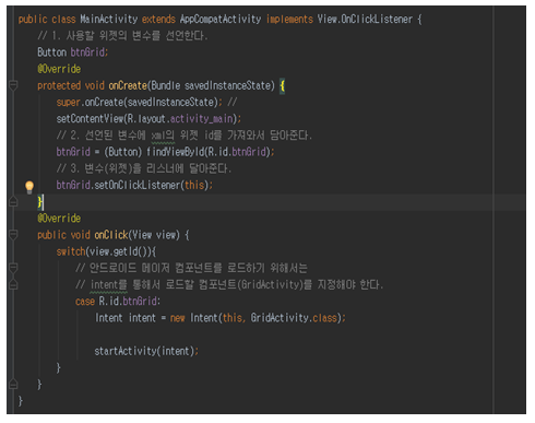 #####새 창으로 넘어가기 위해서는 아래와 같은 절차를 따른다 ######(1) 클래스에 인터페이스로 View.OnClickListner를 implement한다. ######(2) 사용할 위젯(Button)의 변수를 선언한다. ######(3) 선언된 변수에 xml의 위젯 id를 불러와서 할당한다. ######(4) 변수를 리스너를 통해 onClick에 넘긴다. ######(5) 넘어온 객체(view)의 id와 위젯 id가 맞는지 확인한다. ######(6) Intent 객체에 다음 창으로 넘길 class를 인자로 받는다.