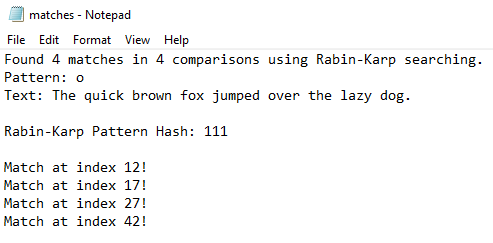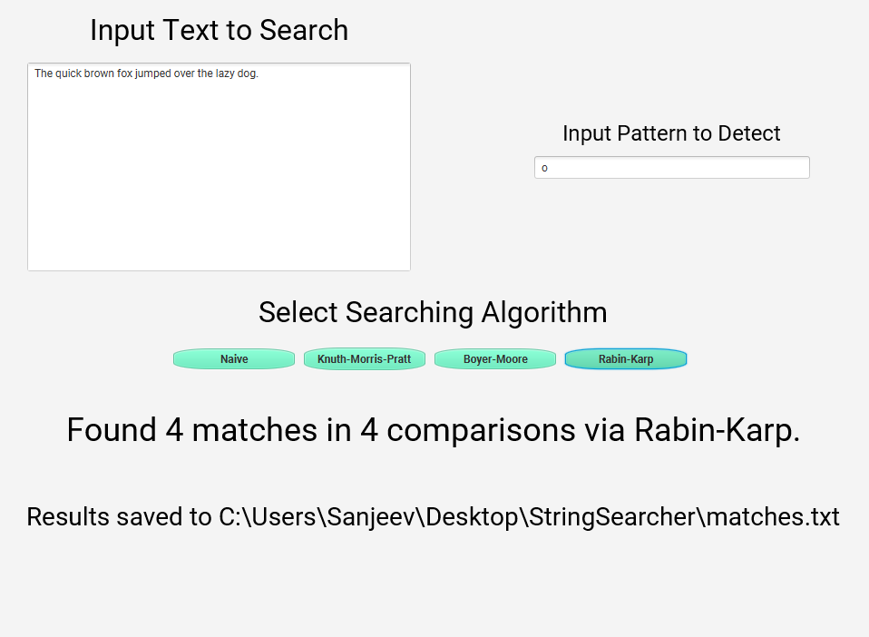 You can input a text you'd like to search and a target pattern, and select which algorithm you want to search with. The results of the search is saved to a local output.txt file.
