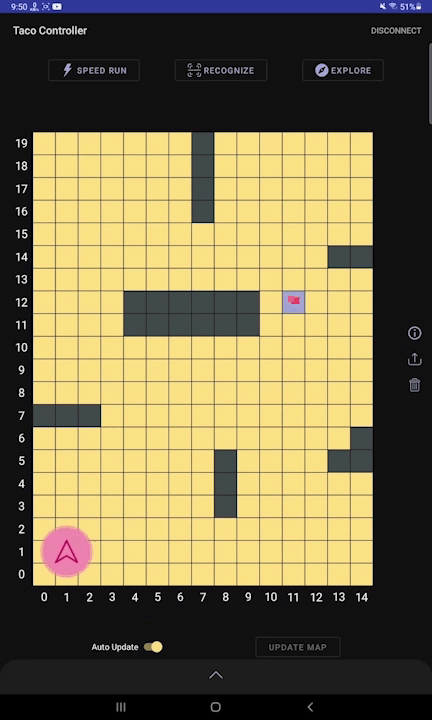 mazeView.updateRobotPosition(0, false);The custom view allows to listen to clicks to the cells, and will pass the coordinates of the clicked cell. Note that the coordinate (0, 0) is at the bottom left side.